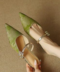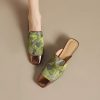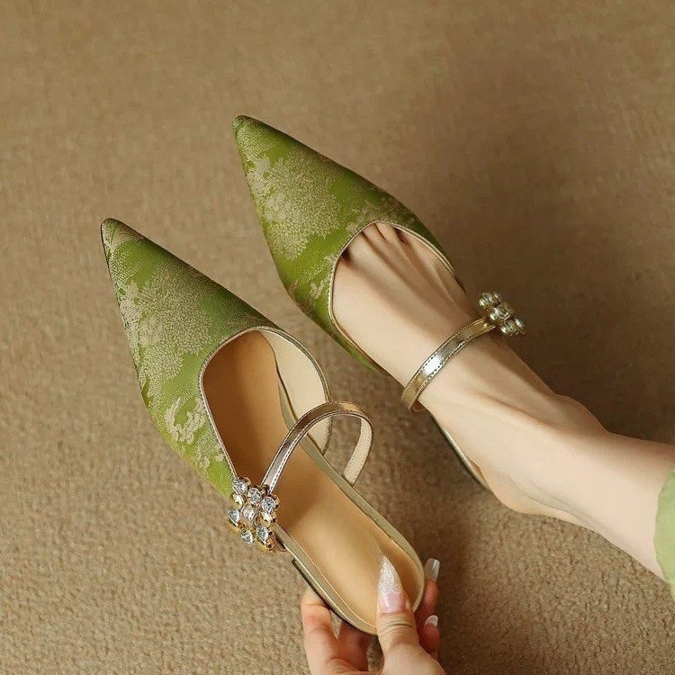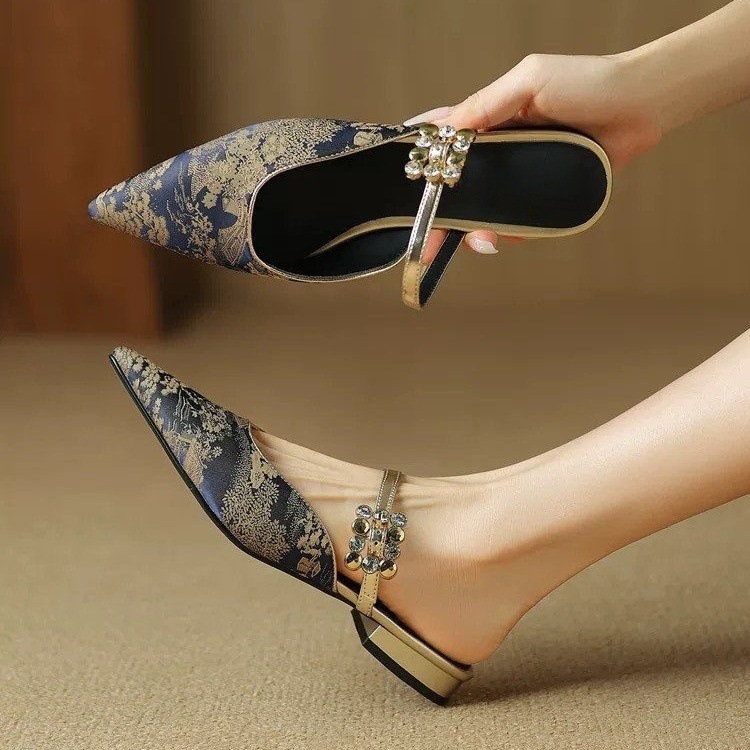 New Chinese style jacquard rhinestone low heel half slippers for women in summer one-line thick heel pointed toe lazy bag-toe sandals
