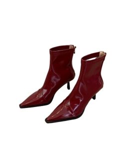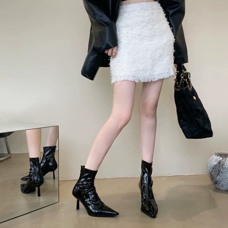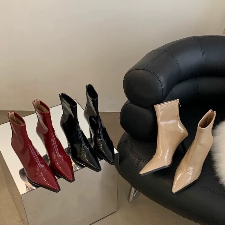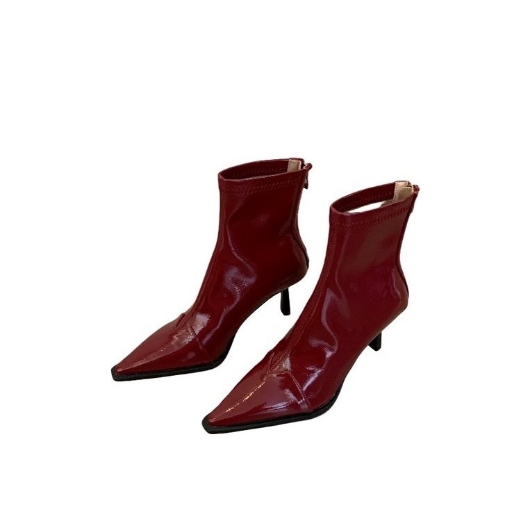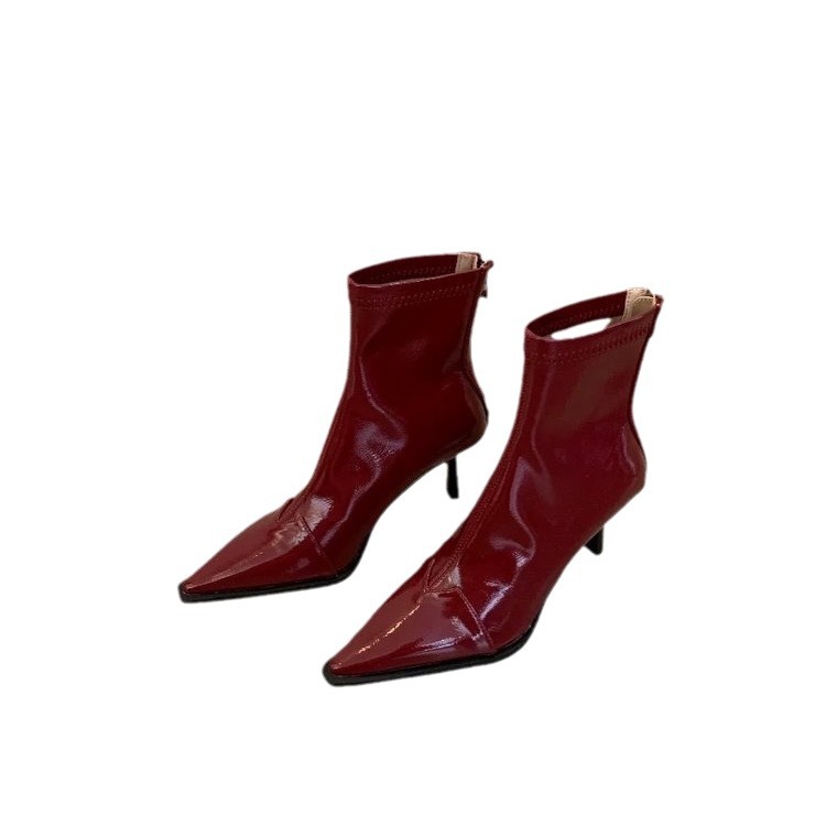New Year’s pointed-toe rear zipper boots retro Hong Kong style thin heel stretch thin boots black patent leather high heel boots
