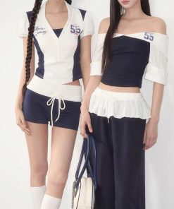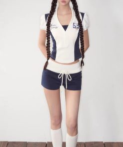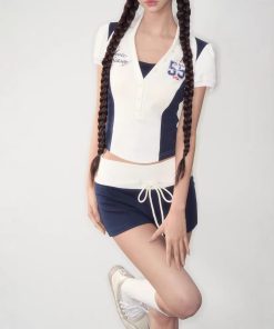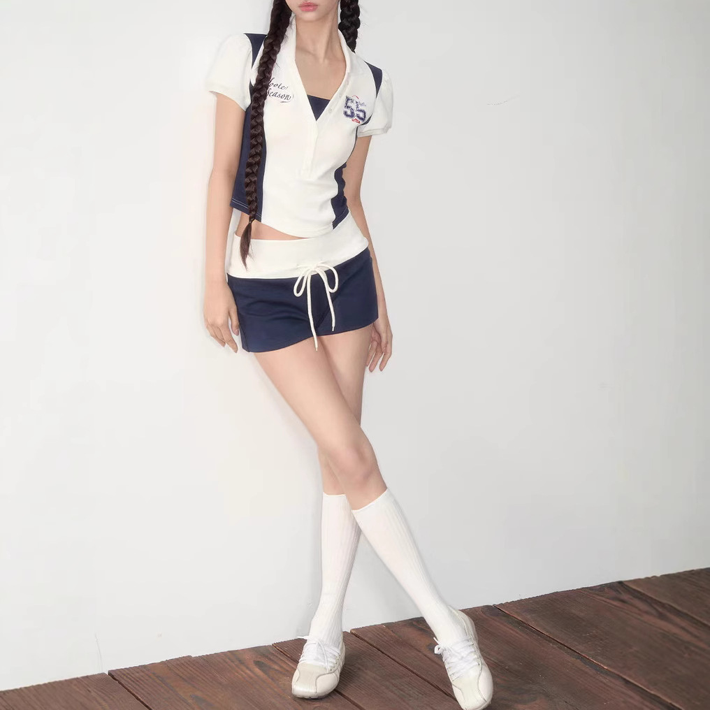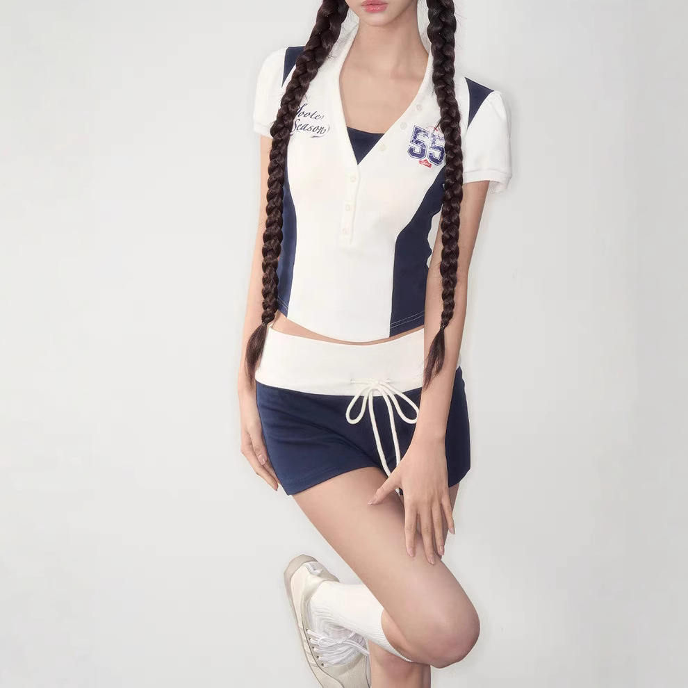 | color | Navy blue top, navy blue shorts |