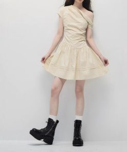 Original summer design and temperament, waist-hugging and slimming shoulder-shaped beige dress for women