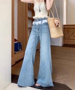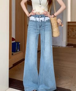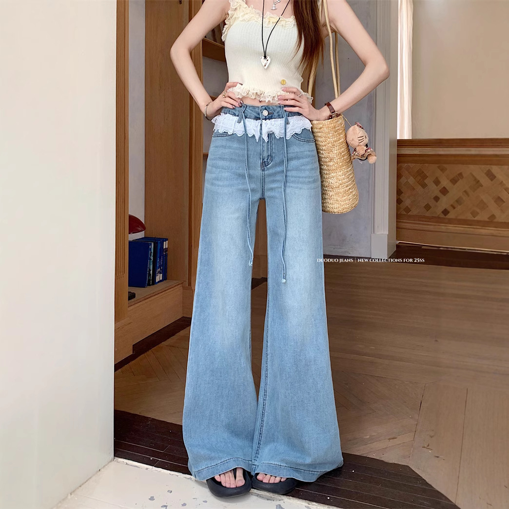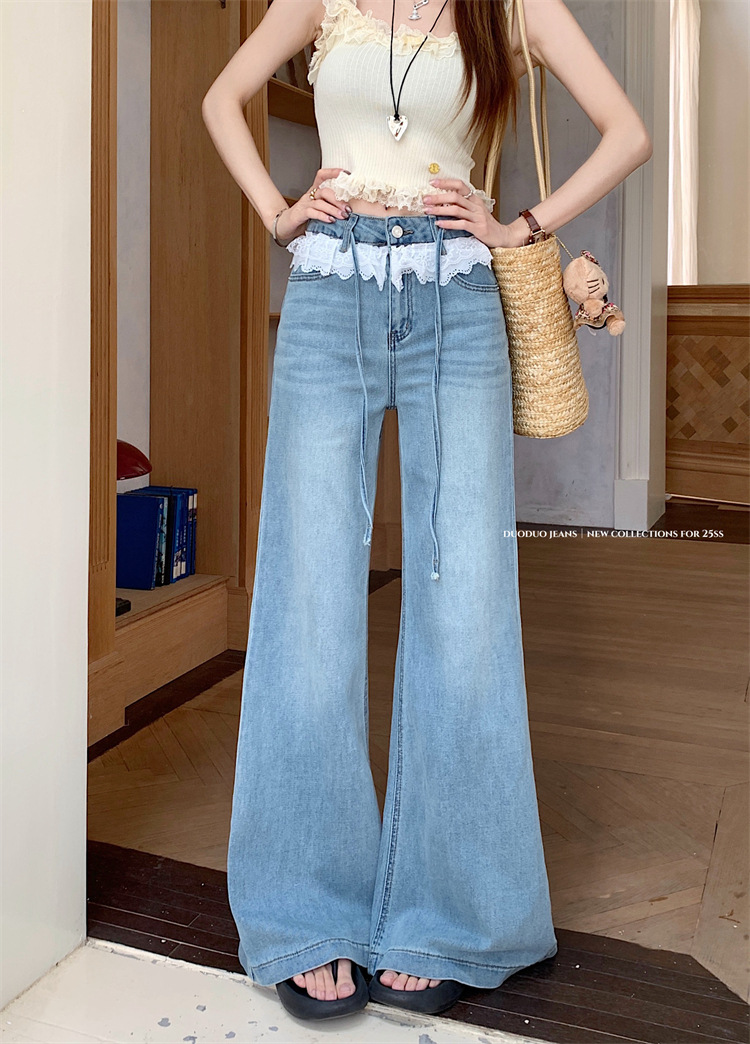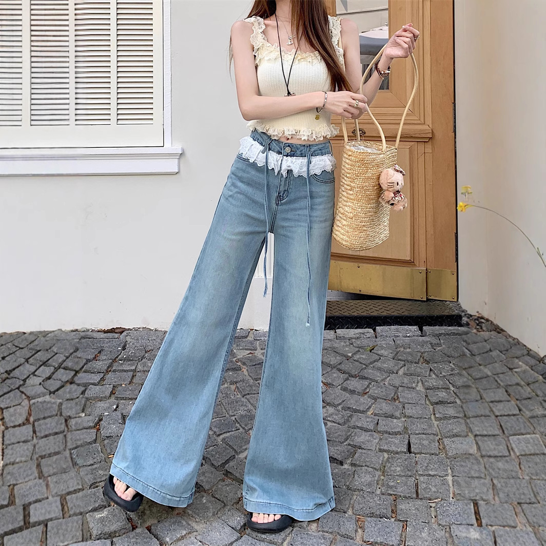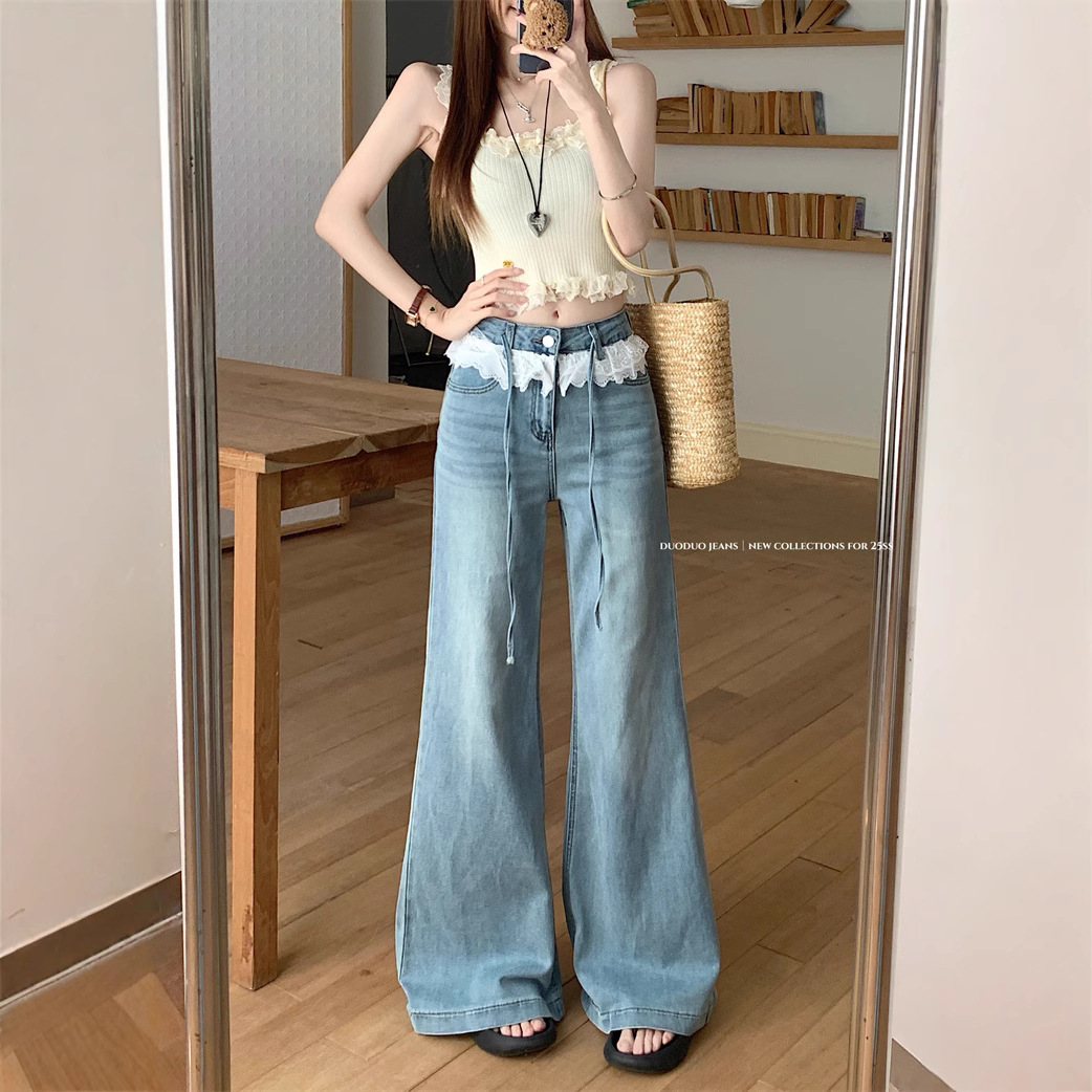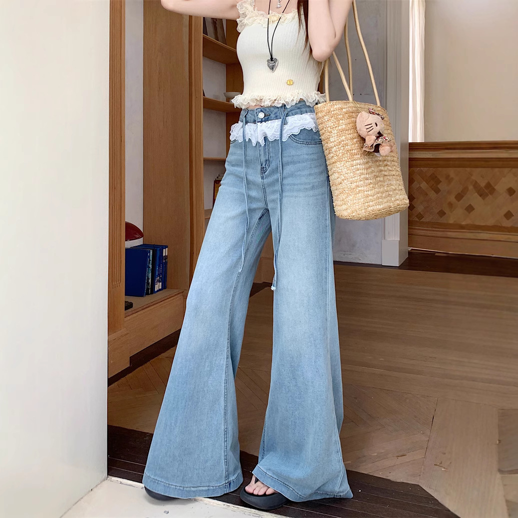 Real photo of lace lace design and slightly flare jeans for women in summer high waist without legs loose wide-leg trousers