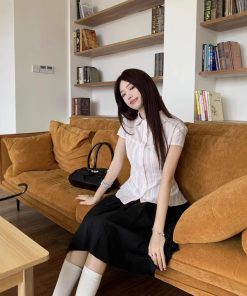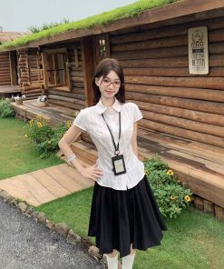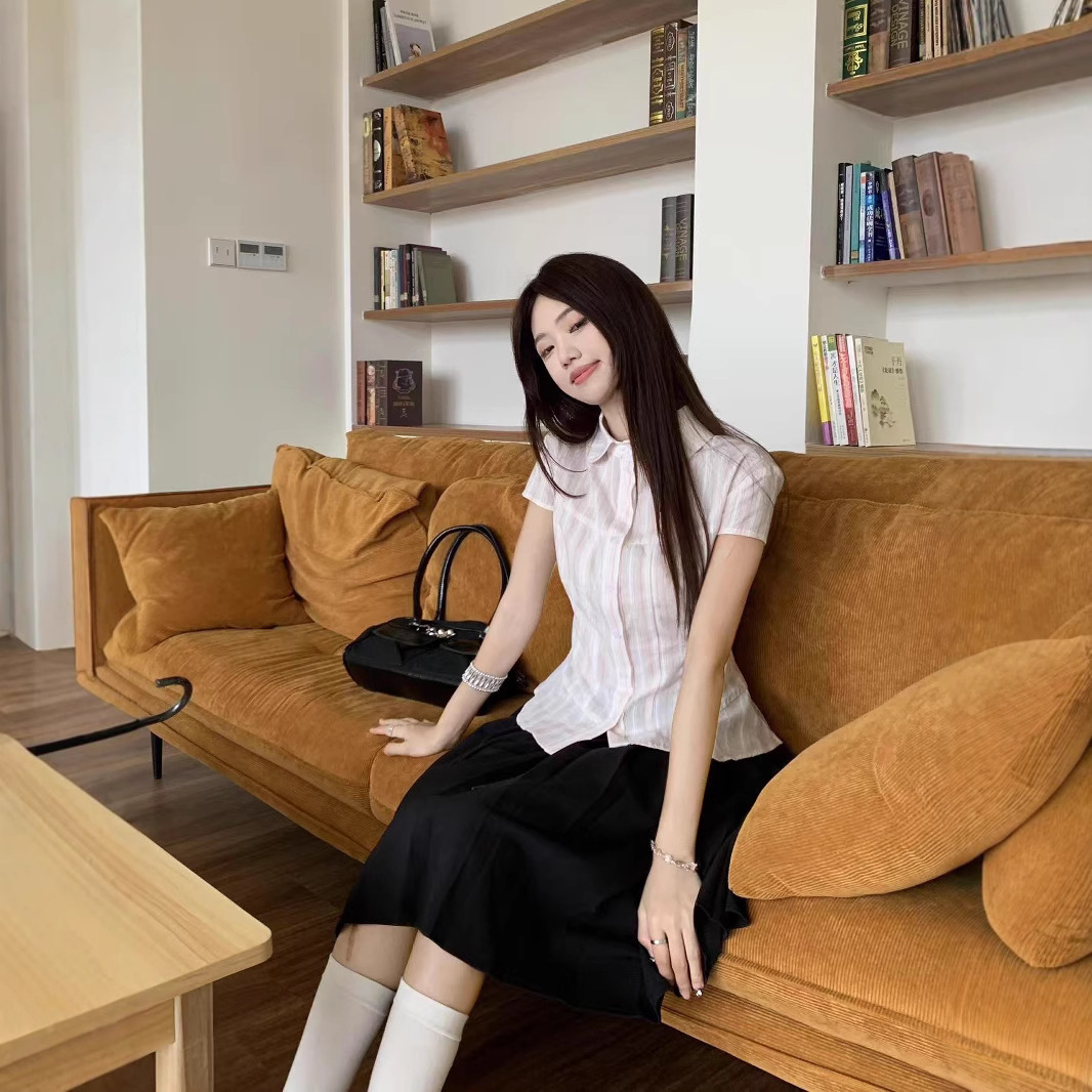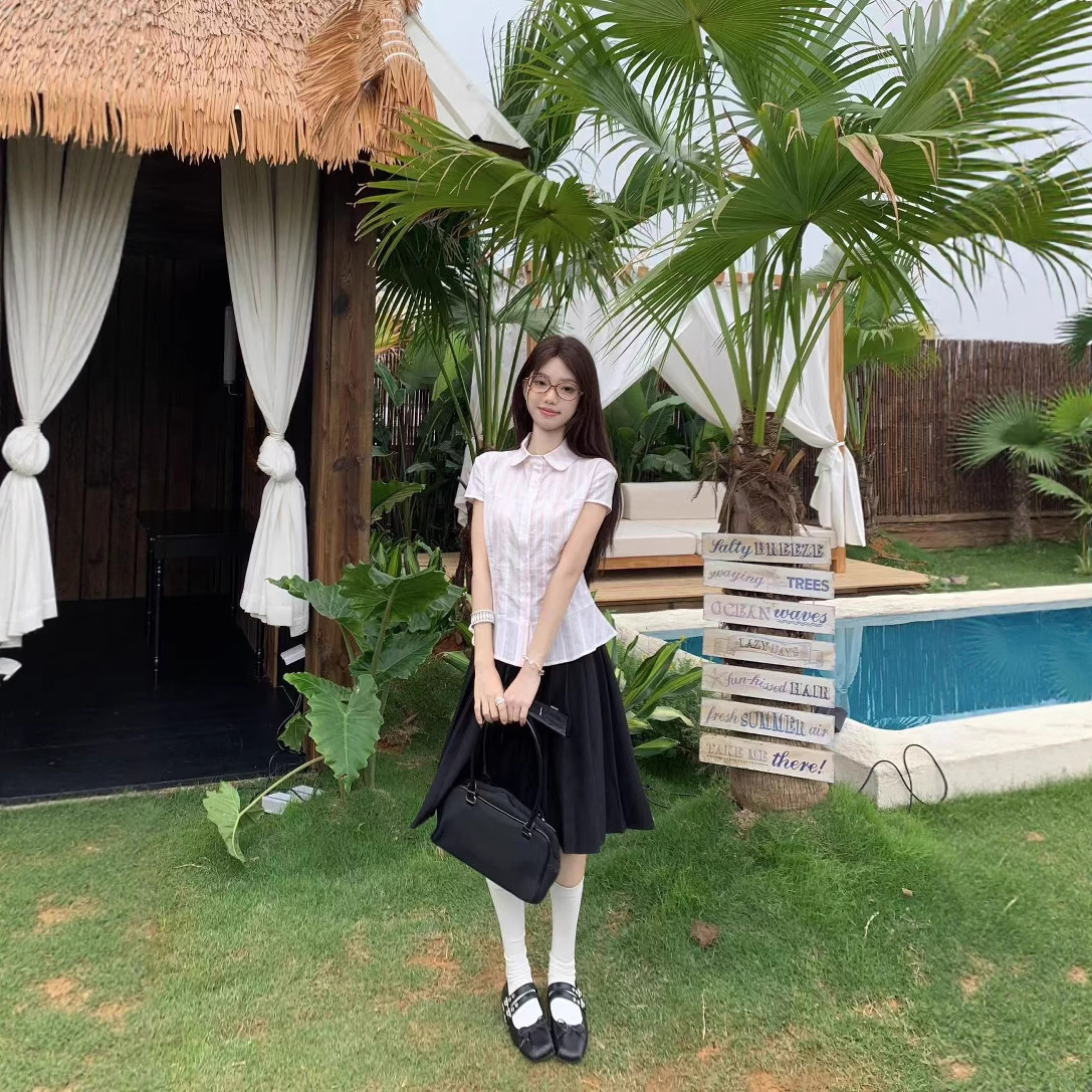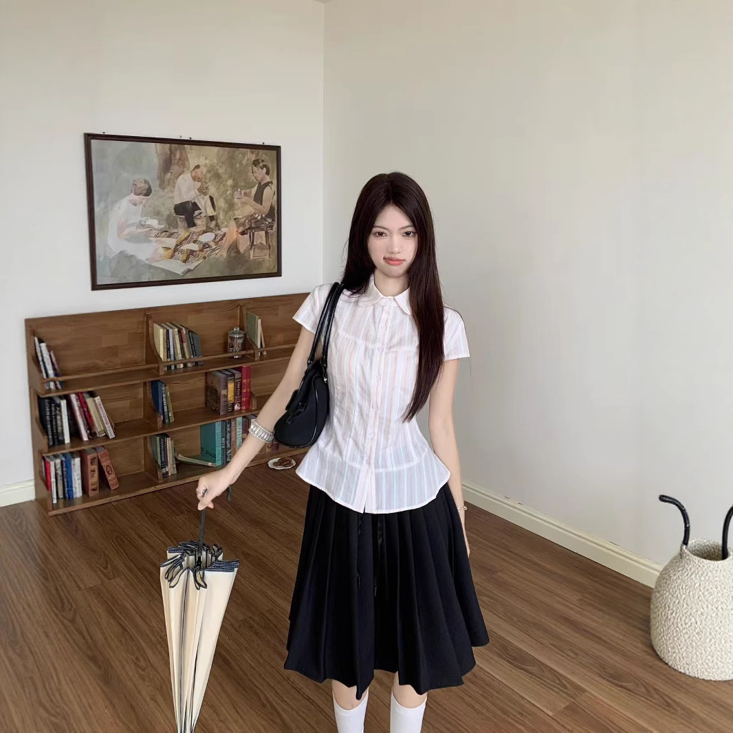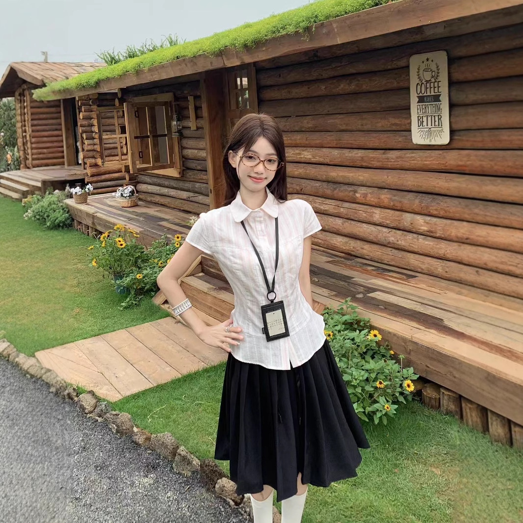 Real shot of girly versatile striped lapel small flying sleeve short sleeve shirt + Japanese pleated skirt
