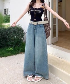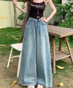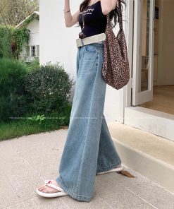 Real shot of retro high waist wide-leg jeans for women in spring and summer loose slim and lazy drooping floor trousers