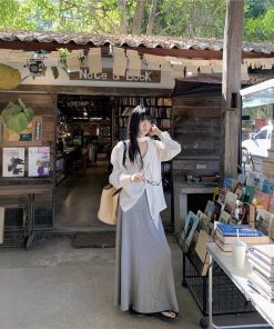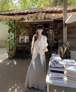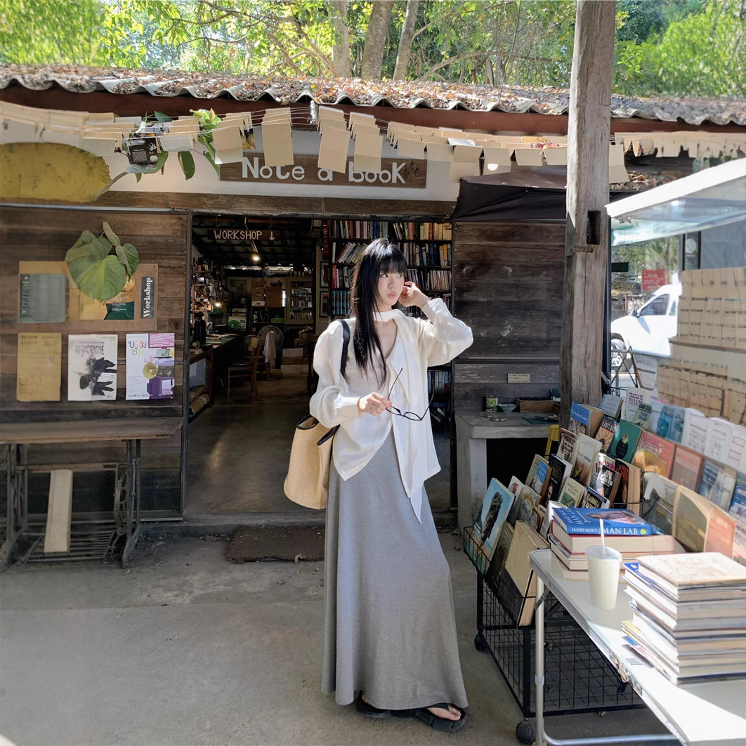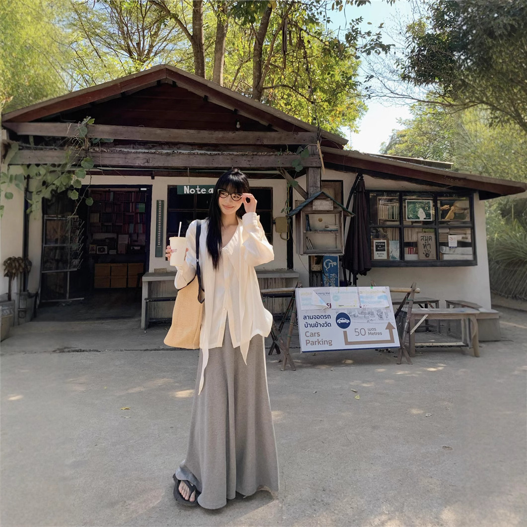 | color | White streamer shirt, Gray skirt |