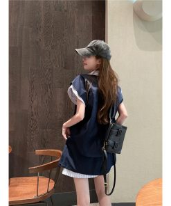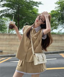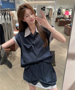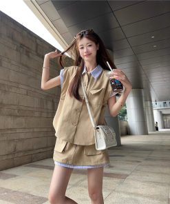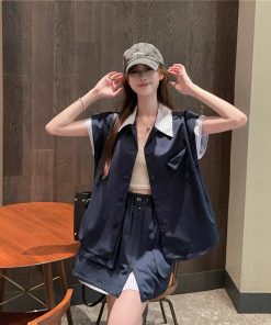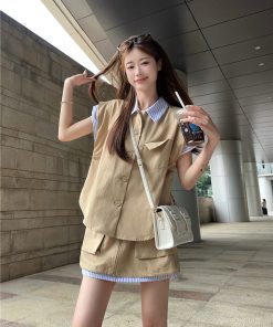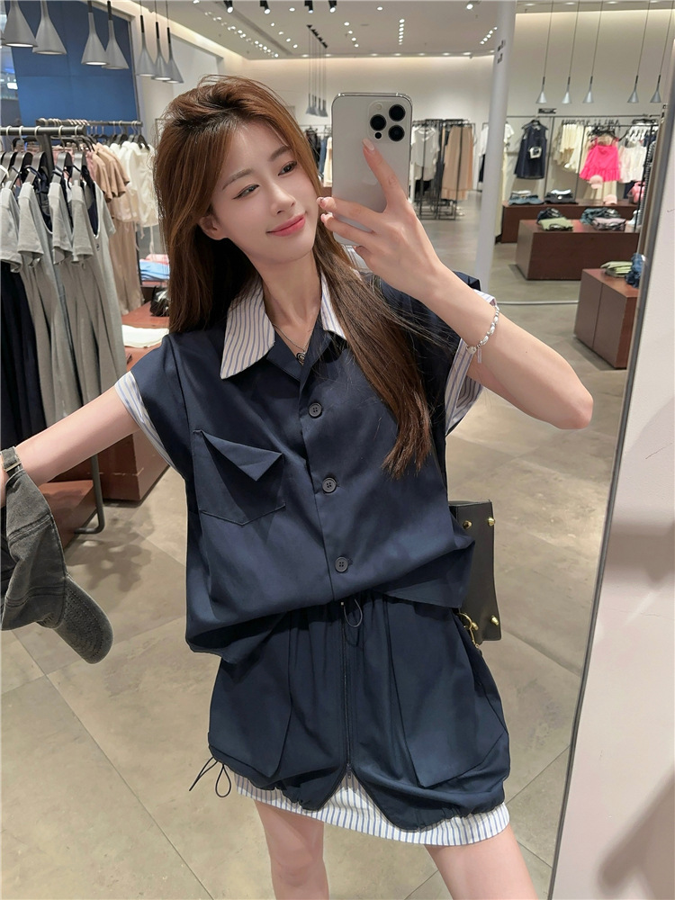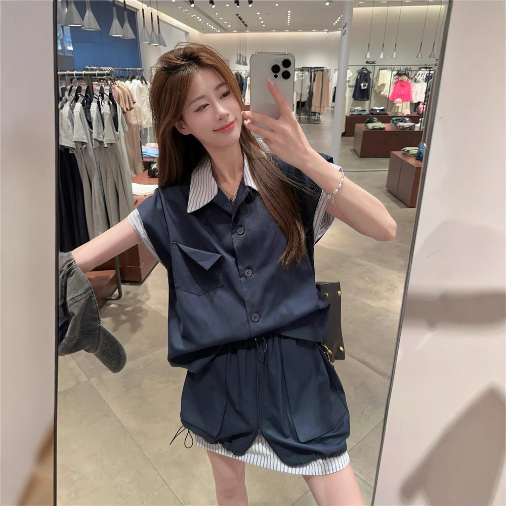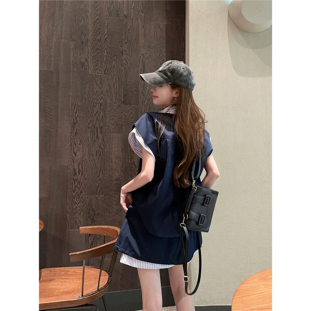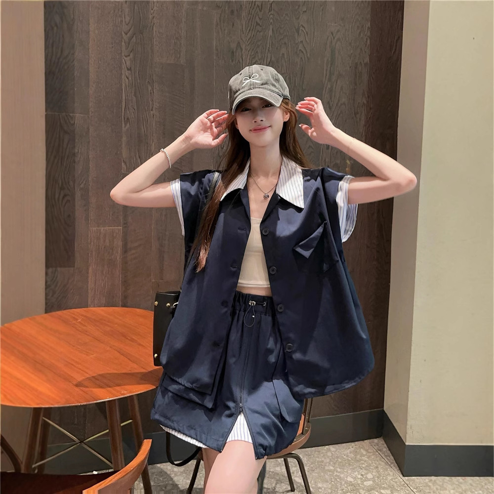 Real shot~Fake two-piece splicing design-sleeved lapel sleeveless casual vest work skirt fashion suit for women