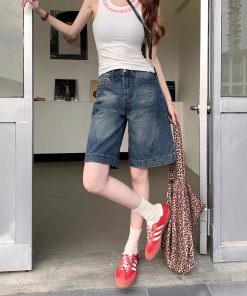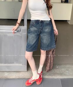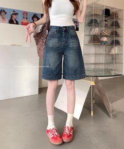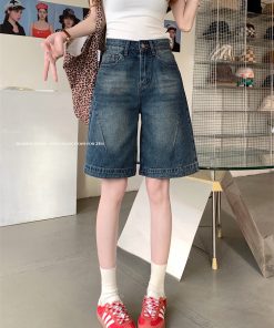 Real shot~Retro hot girl cropped pants denim shorts women’s high waist loose design wide-leg mid-length pants