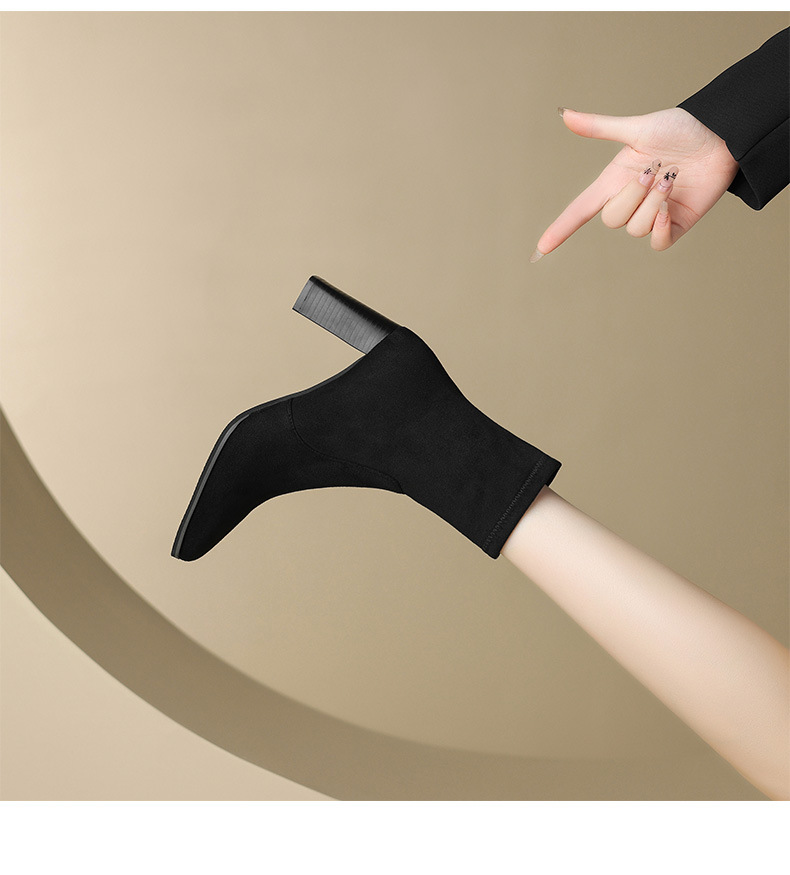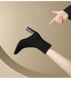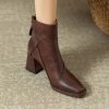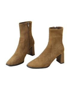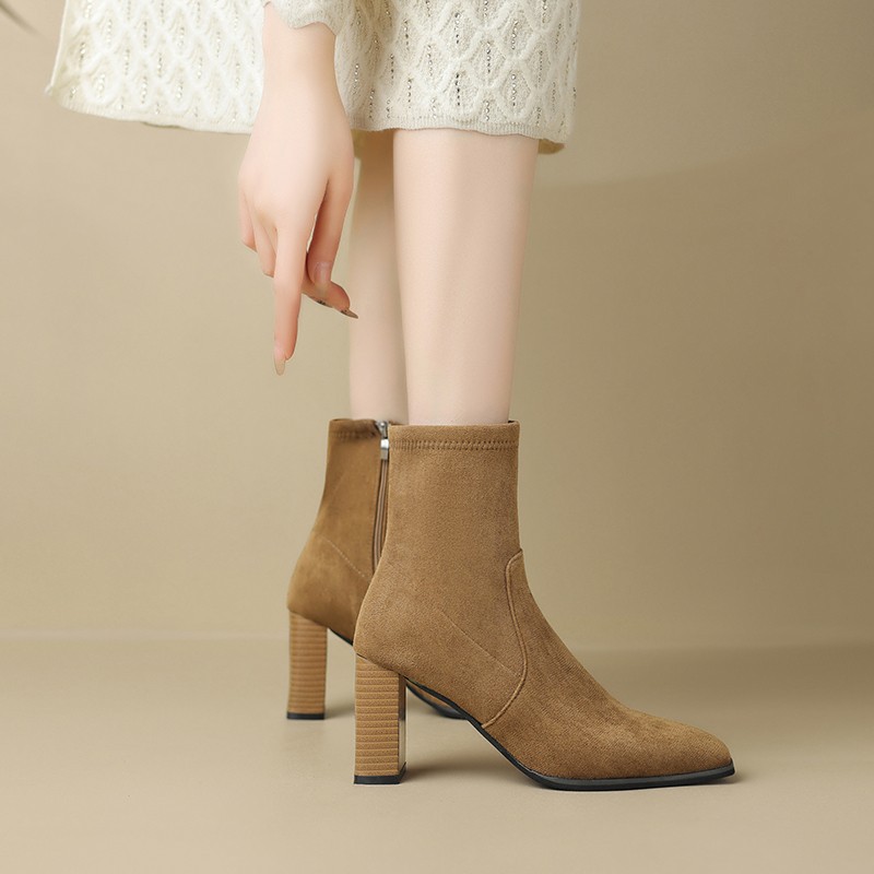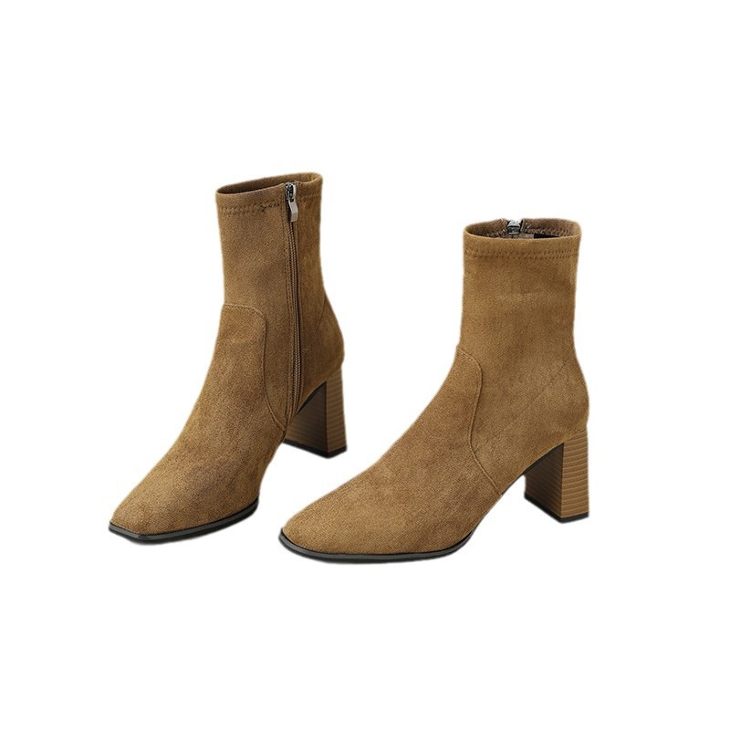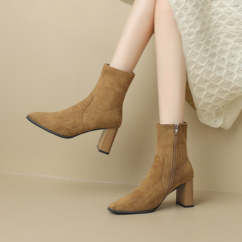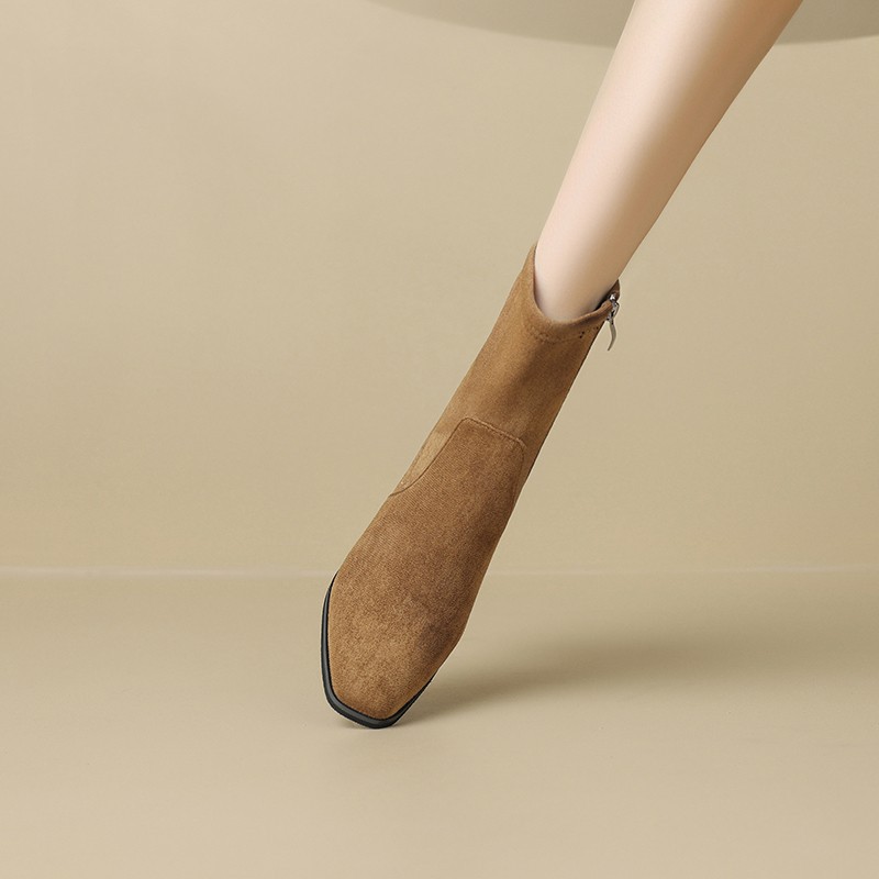 Retro British style thick heel Martin boots autumn and winter suede square toe side zipper short boots thin stretch boots