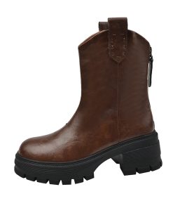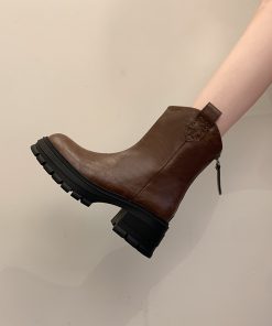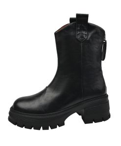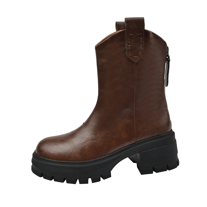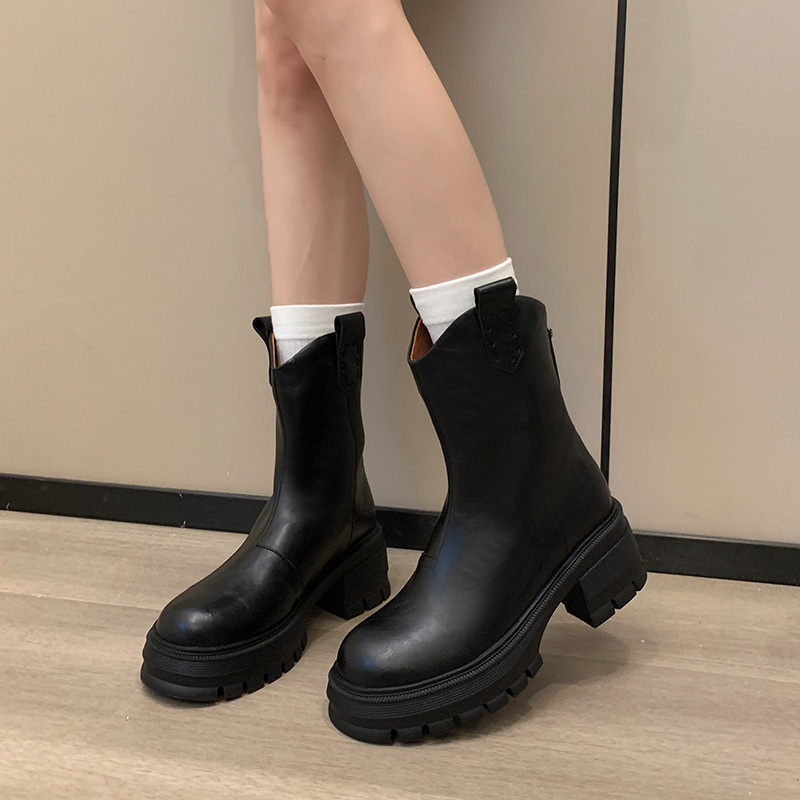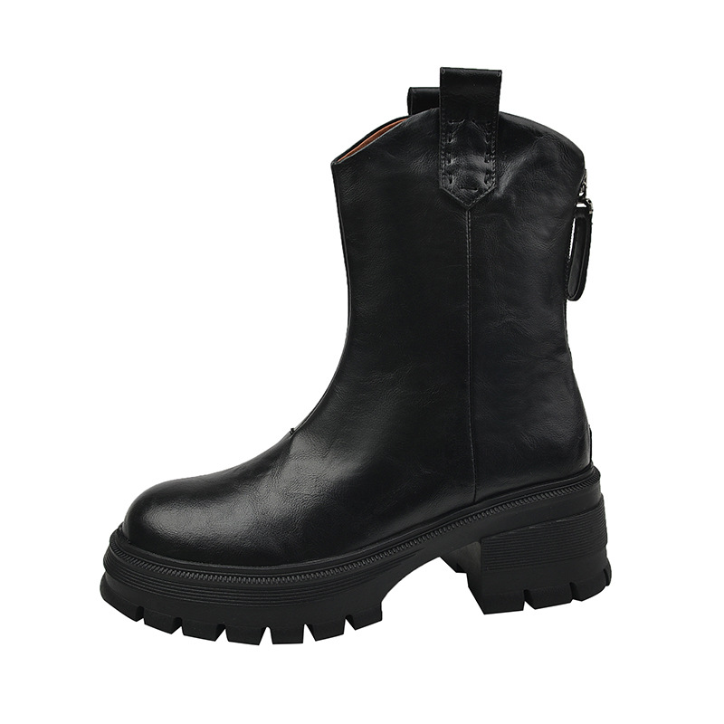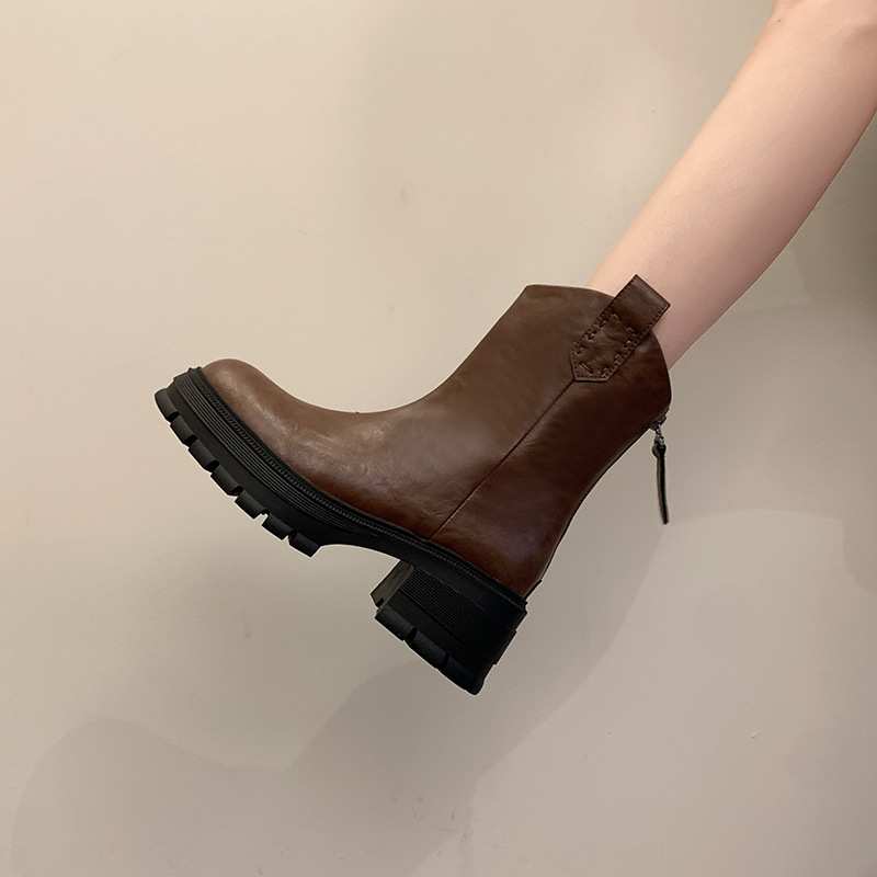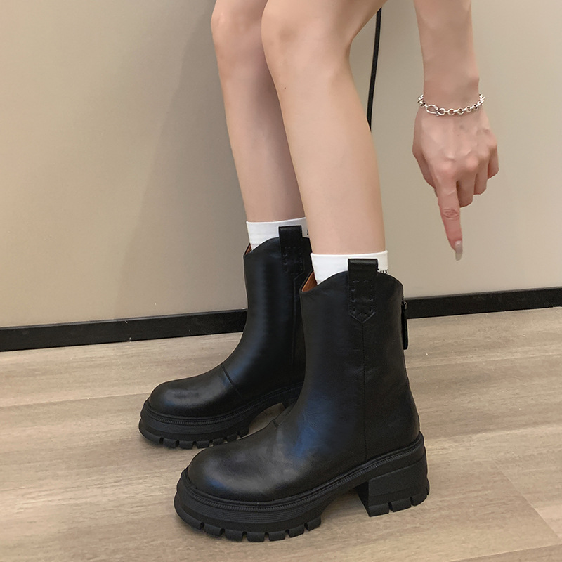 Soft leather thick sole zippered boots for women, slim and low-tube British style Martin boots simple retro western boots