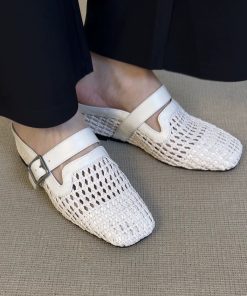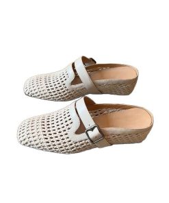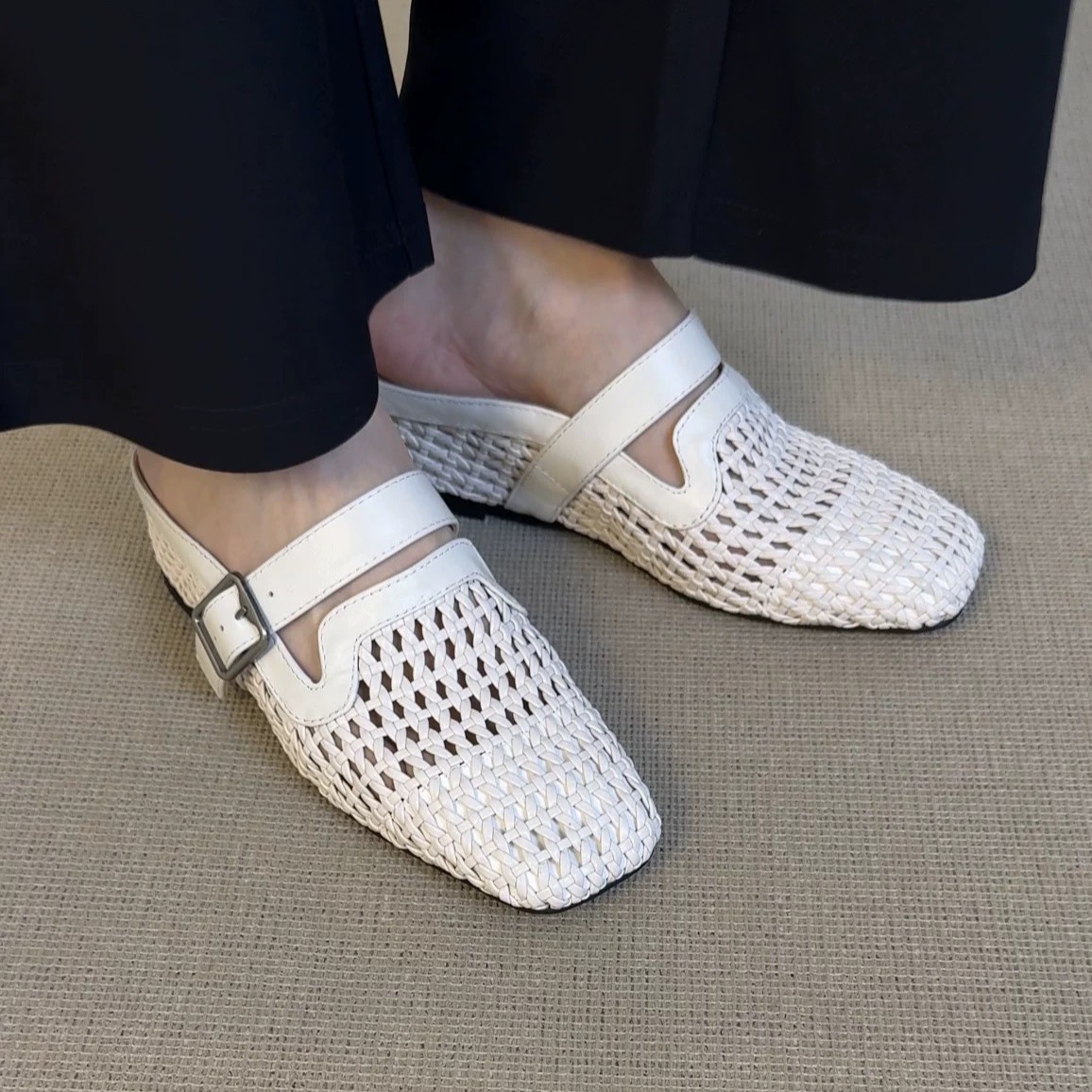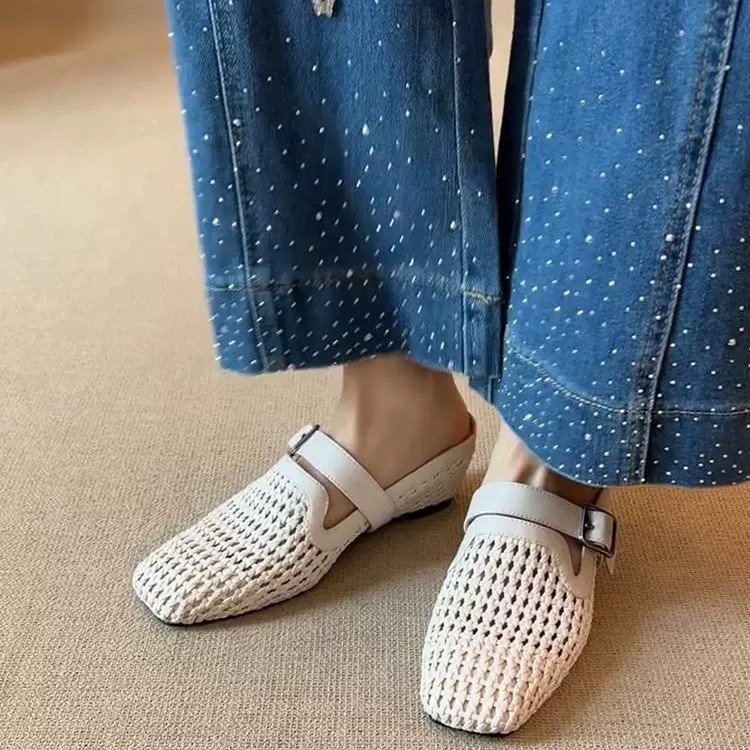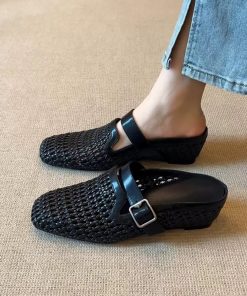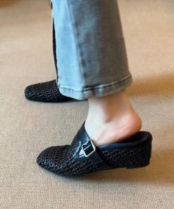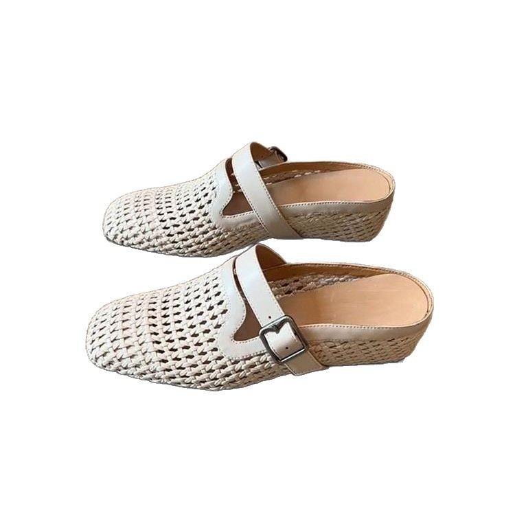 Spring and summer French woven vacation style wedge bag-toe sandals for women wearing belt buckle mules