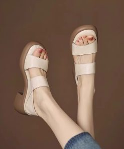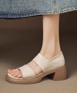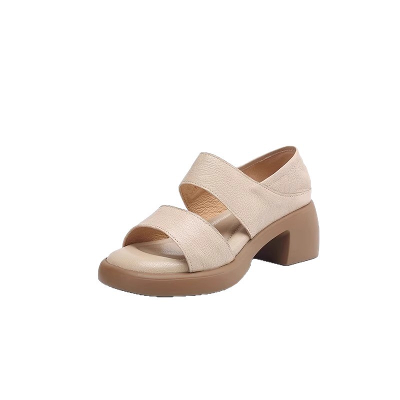 Sticky-soled bag and heeled sandals for women, summer apricot color soft leather soft sole, not tired, open toe thick high heeled fairy shoes fashionable