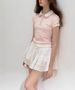 Sunset Park Pink, blue and gray spliced ​​fake two-piece rhinestone collar short-sleeved stretch-shirt top