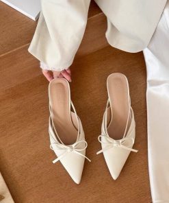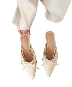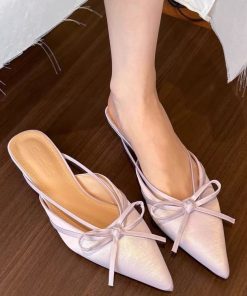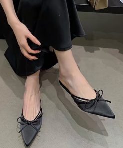 Thick heel bow bag half slipper fairy shoes spring and summer satin French temperament half-scroll single shoes