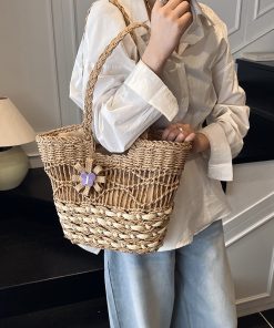 Woven straw shoulder bag versatile large capacity tote bag with lining hollow wave ripples summer beach women’s bag